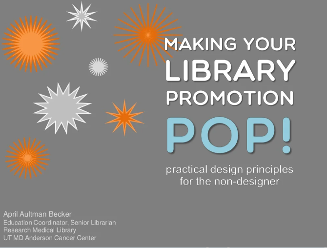 I attended a great Medical Library Association (MLA) webinar entitled “Making Your Library Promotion Pop! Practical Design Principles and Tools for the Non-Designer” last week by April Aultman Becker, Education Coordinator for the Research Medical Library at the University of Texas MD Anderson Cancer Center. Though originally held in September, it was re-hosted courtesy of Capital Health, Health Sciences Libraries and through the marvels of modern technology.